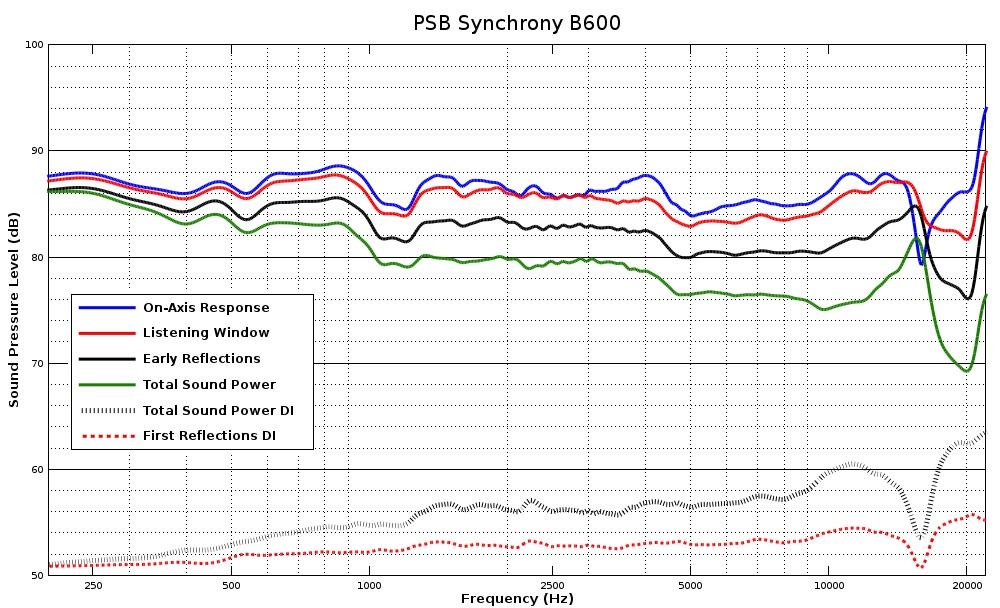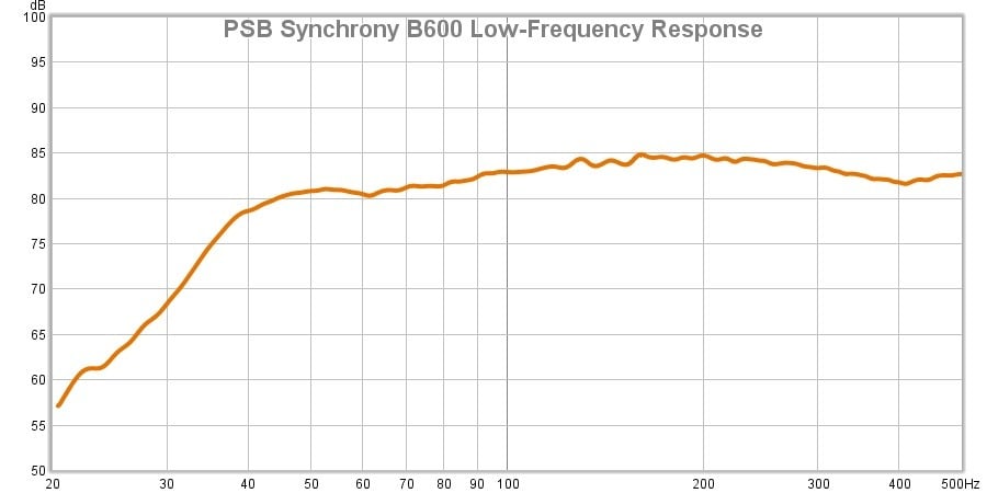 The PSB Synchrony B600 was measured in free air at a height of 7.5 feet at a 1-meter distance from the microphone, and the measurements were gated at an 11-millisecond delay. In this time window, some resolution is lost below 250 Hz and accuracy is completely lost below 110 Hz. Measurements have been smoothed at a 1/24 octave resolution.