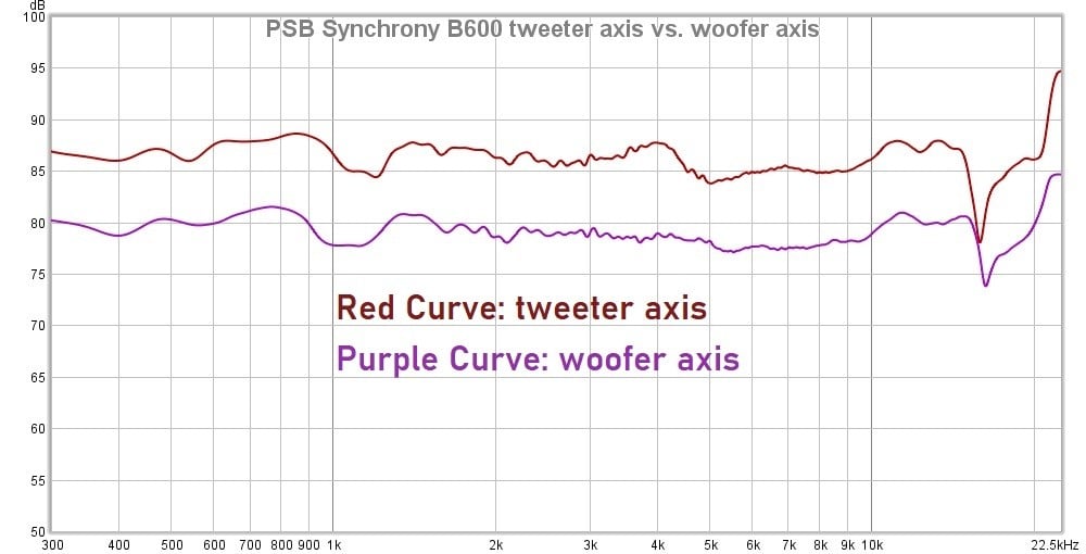 The above graph illustrates the difference that the frequency response takes when measured level with the woofer and measured level with the tweeter. Since the tweeter is the lower driver on this speaker, the woofer is more likely to be the driver at ear level, and when we look at the response measured on the woofer’s plane, it turns out to be a bit smoother in the treble range. All of the above graphs were made using the tweeter as the reference axis, but they would have been somewhat flatter were the woofer used as the reference axis. Tonally, there probably wouldn’t be a big difference in sound between the two, but it’s interesting to observe nonetheless because normally measurements conducted at the woofer level are less linear, but in the B600s, the woofer level is more linear, at least in the treble. The moral of this story is that for the most neutral sound from these speakers, listen with woofer at ear level, not the tweeter.