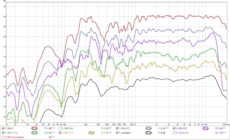 The graph below shows the frequency response of the RBH MC-4C HD on-axis (red), 15 (blue) and 30 (purple) degrees off-axis horizontally, 15 degrees off-axis above (green) and below (yellow) the tweeter, and an average of these responses (black) at 1 meter, smoothed 1/12 of an octave, and offset for easier viewing. All measurements were taken in room, so keep in mind that the low-frequency response is affected by room modes.