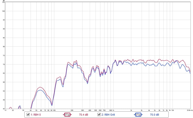 All previous measurements were taken with the grill off, while I did the vast majority of my listening with the grill on. In the graph below, you can see on-axis measurements with the grill on (blue) and off (red).
