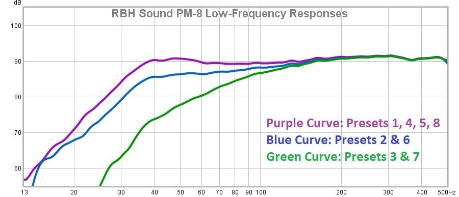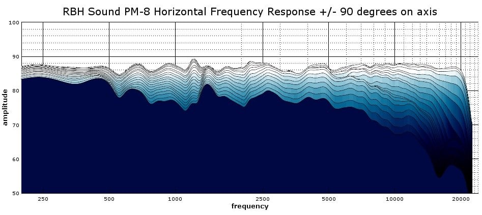 The RBH Sound PM-8 was measured in free-air at a height of 7.5 feet at a 1-meter distance from the microphone, and the measurements were gated at an 11-millisecond delay. In this time window, some resolution is lost below 250 Hz and accuracy is completely lost below 110 Hz. Measurements have been smoothed at a 1/12 octave resolution.