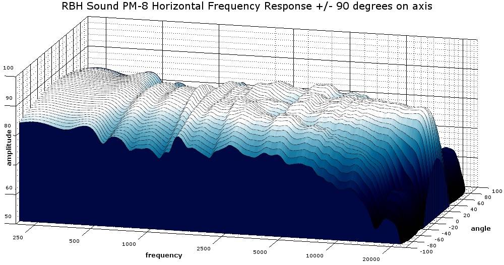 As a consequence of their steep 48dB/octave crossover slopes, the PM-8s exhibit very little crossover cancellation. In fact, the vertical off-axis response is unusually good. These speakers may well be usable on their sides, in contrast with many other two-way speakers in this class. Many studio monitors use waveguides in an attempt to limit vertical dispersion based on the idea that acoustic reflections off of desktops or mixing consoles degrade the sound. Implicit in that idea is that the vertical dispersion patterns of most two-way designs are badly flawed. RBH Sound takes a different approach: they do not limit the vertical dispersion but rather ensure that it has good correlation to the on-axis response. In other words, there is no need to confine the vertical dispersion if the reflections that it produces are benign. Aside from the matter of reflections, PM-8 users benefit from this excellent vertical dispersion by being able to listen at lower or higher angles and still be met with a full sound as opposed to many other speakers of this type.