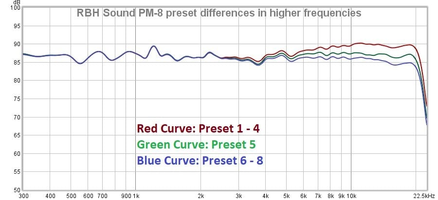 The above graph exhibits the changes that can be made to the PM-8’s treble response using the preset knob settings. The red curve represents presets 1 through 4 and is intended for further distance placements that can attenuate higher frequencies. The green curve represents preset 5, which is also intended for far-field placement but shelves the high frequencies by 3dB. The blue curve represents presets 6 through 8 and is the response intended for near-field placement. Preset 5 gives the most neutral anechoic response from these options, but those who are looking for a more detailed, forward sound might enjoy presets 1 through 4 more, and those looking for a slightly more relaxed sound use presets 6 through 8.