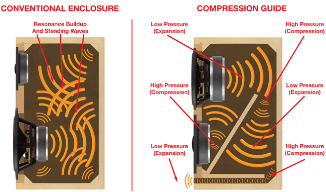 According to RSL: The Compression Guide is our patented tuning method that divides the internal cabinet in sections of high pressure (compression) and low pressure (expansion). As the wave passes through these areas, the effects of cabinet resonance is reduced. By reducing the effects of cabinet resonance and its associated muddiness, clarity is increased. Also, bass overhang is reduced (listen to the sub especially).