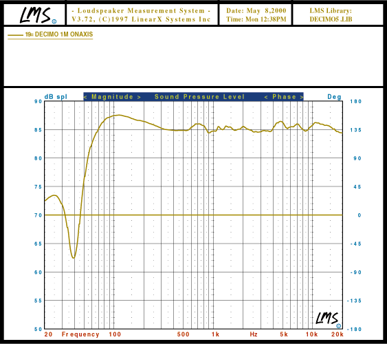 A Speaker should have uniform phase response within the audible spectrum. Preserving phase of a speaker is an important factor as you don't want to shift between inductive reactive or capacitive within the audible band as it may become obtrusive to the ear. Below is a phase vs frequency plot of the Decimo's for illustrative purposes. Good phase response also ensures uniform impedance presenting an easy load for the amplifier to drive efficiently.