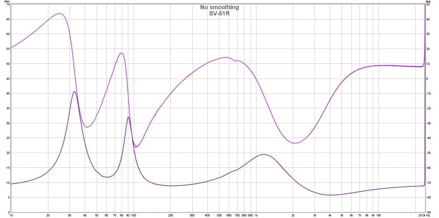The SV-61R’s impedance curve exhibits an overall benign load. Impedance stays above 8 ohms until up to 3 kHz. At its lowest, it dips down to 6 ohms from 4 to 5 kHz, but the phase angle is not extremely steep around this minima, so this is not a particularly taxing load at any one point. All steep phase angles occur at high impedances, which makes for an easy amplification load. We can see from the dip in the low-frequency saddle that the port tuning frequency is 60 Hz. This speaker can be easily run on any amplifier and has no special amplification requirements at all. This is evidence of smart design and well thought-out engineering.