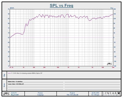 I measured the SVS Ultra bookshelf at 1 meter in-room on-axis, +-30 deg off-axis horizontal and +- 15 deg vertical off-axis to derive the listening window response. The curve was then spliced with a groundplane measurement at 500Hz to eliminate room effects below the transition frequency. Port contribution was not fully captured but I estimate the -3dB pt to be around 50Hz based on this measurement and the impedance measurement. I confirmed SVS’s sensitivity rating of 87dB was accurate and the speaker measured very linearly throughout the entire audio bandwidth which explained why it sounded mostly neutral in our listening tests.