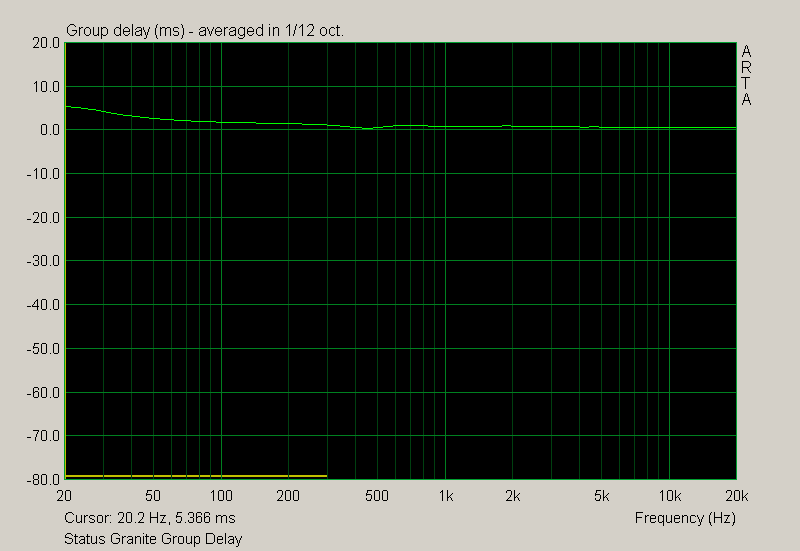 The group delay graph shows the rate of change of the slope of a loudspeaker’s phase. As a rule of thumb, values below 1.6ms in the mid to high frequencies will likely not affect perception of sound quality. Increasing group delay in the low frequencies is not as objectionable as it is in the mid to high frequency ranges.