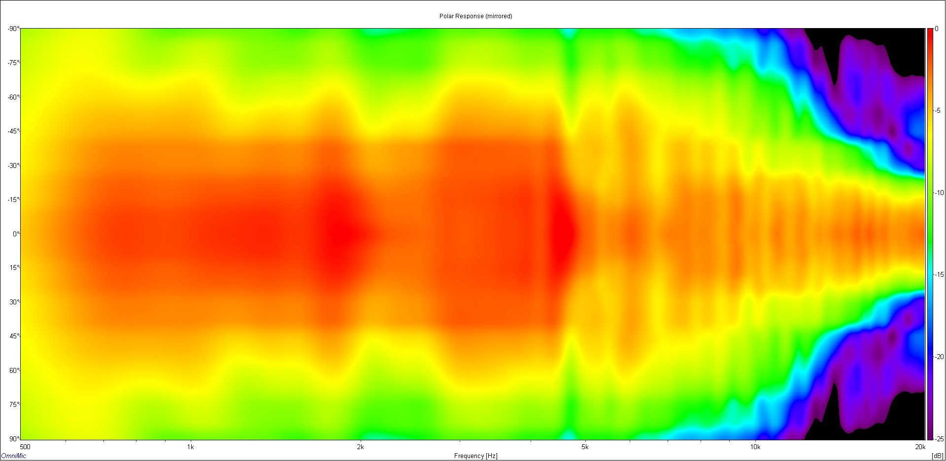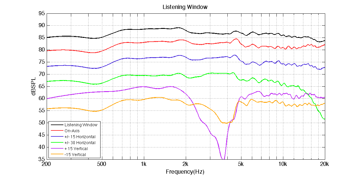 The frequency response dips measured here are pretty typical. There is always an axis that produces the max SPL without interference. The dips are simply from off-axis phase cancellations between the drivers. This is the same thing that’s at work in a center-channel speaker with horizontally-arrayed drivers, except that the dips are now side-to-side, not up and down.