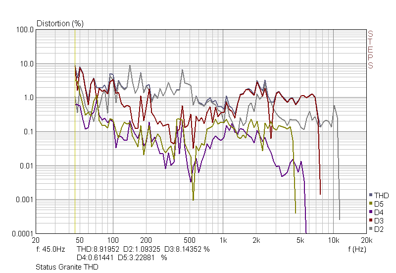 Cumulative spectral decay is derived from the impulse response measurement made with a 90dB excitation signal at 1 meter. The cumulative spectral decay shows how sound at various frequencies dies out as a function of time. It is important to note that the left most ridge is not valid and is a product of the measurement technique. The CSD for the Status Granite is excellent. The ridge protruding between 4kHz and 5kHz is oddly the same place that we have vertical off axis issues. However, the ridge dies out very quickly and definitely will not contribute to any sort of ringing.