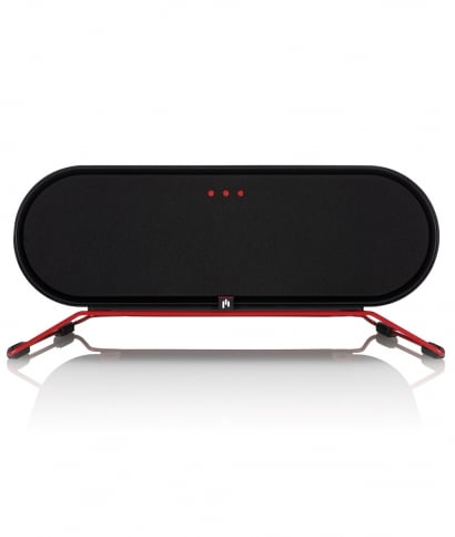 Overall, the body of the Allaire ARIS is one of the sharpest I’ve seen in a while. Featuring a single-piece black brushed aluminum body and a black cloth grille, the speaker itself sports a modern, intelligent look. The speaker also features an adjustable, solid deep red steel stand, which angles the speakers either up or down and can be removed if desired. Both the speaker and stand have black, rubber coated non-slip feet, which allows the ARIS to be placed on any surface without the fear of slipping or rattling, especially at high volumes.