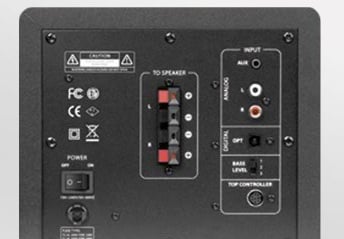 - Remote control pod for volume adjustment, 3D/music mode selection, muting and digital/analog input selection