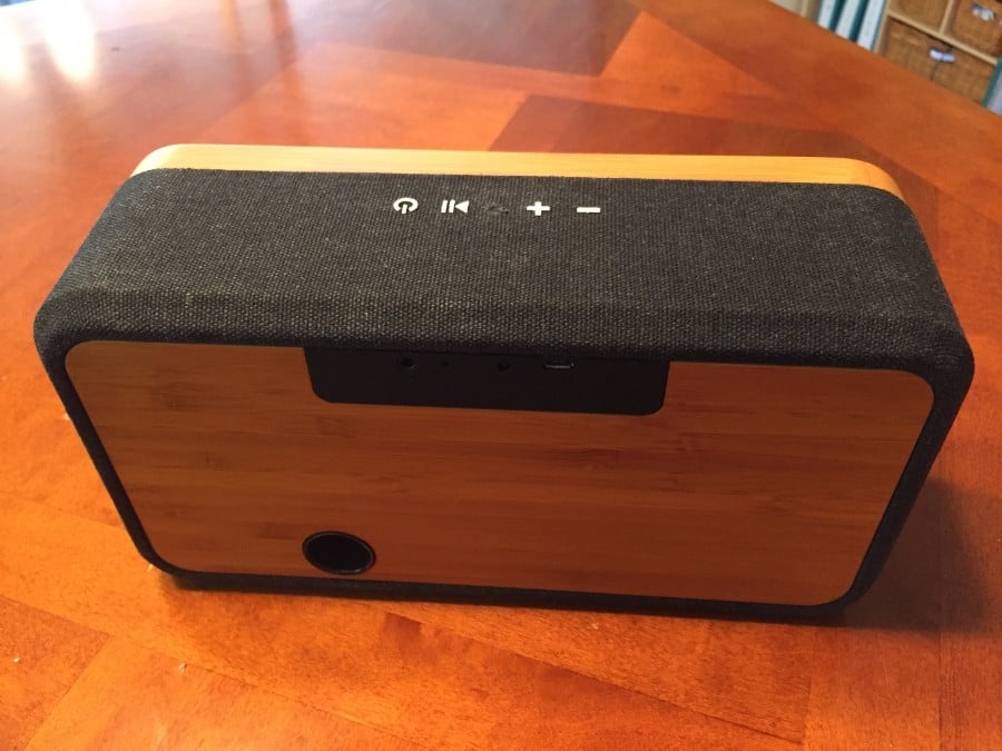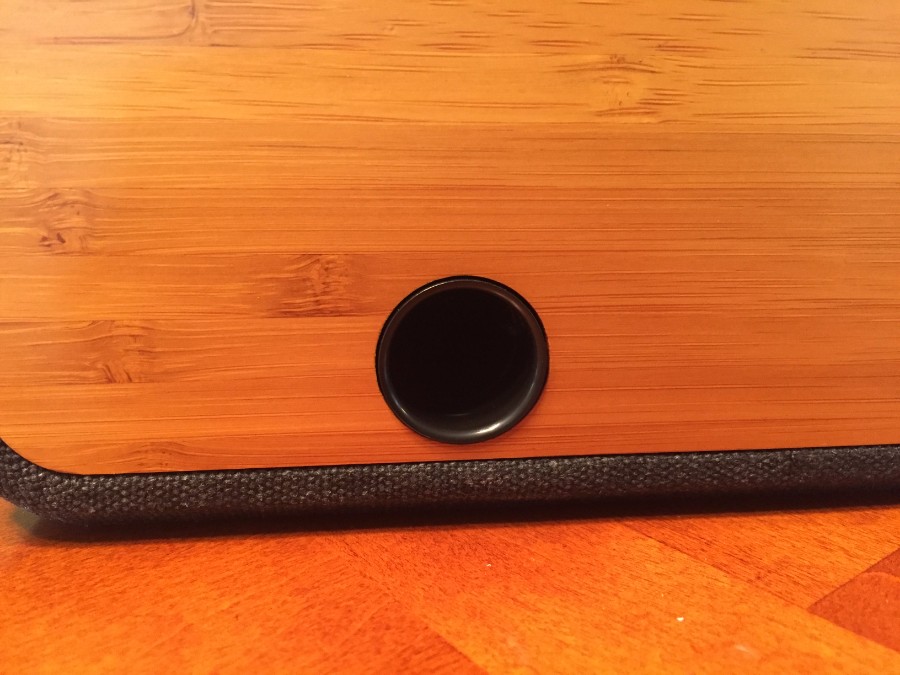 Looking over the unit, I liked the clean design of the inputs and controls. I could have done without the feel of the fabric wrapping, but that is a matter of personal preference over actual problems with the speaker. Since it is in fact a portable device there is some concern that over time the material may wear. I suppose only will tell but the soft dark gray, not quite black, textured material transitions nicely to the bamboo wood in the front and back of the unit. The material does an adequate job of holding the speaker in place even during higher volumes. Some consumers might opt for small rubber stick on feet attached to the bottom of the speaker to help decrease wear and tear on the fabric which the speaker rests on. They will also serve to decouple the cabinet from the surface to reduce resonance. I think it will be a good addition, and if I decide to keep this little gem, I’ll probably add them myself.