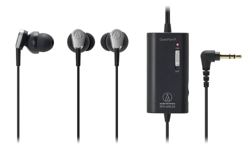 A little of both, Audio-Technica has recently started shipping their new in-ear ATH-ANC23 QuietPoint active noise-canceling headphones. These in-ear monitors will only run you $100 suggested but probably $20 less than that if you look around. With them, you get up to 20dB of noise canceling all run off a single AAA battery.