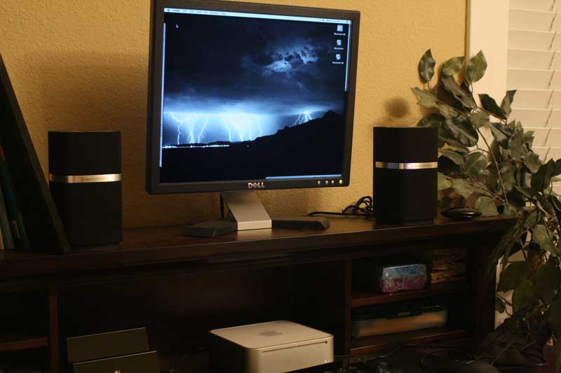 While the USB port allows for software updates, we aren't aware of any at present and there doesn't seem to be anything on the horizon that would require it, especially since the required drivers for the speaker seemed to load quickly and as-needed on our testing PCs (a 2009 MacBook Pro, 2007 Mac Mini, and a Gateway EC1437u Netbook). On the bottom of the right (active) speaker there are three connections. One is for power, one for the slave (passive) speaker, and the third for USB connectivity to a PC or Mac. On the rear side of the right speaker you'll find the headphone output and 1/8-inch mini-jack line input.