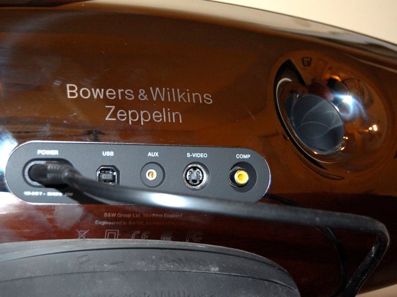Turn the Zeppelin around to reveal the same polished stainless steel finish, along with two bass ports and a small connection panel. The panel has inputs for a (removable) power cord, a USB slave socket for software updates, an AUX 3.5mm jack input socket for analog or optical digital (with adaptor) source, an S-video output, and a composite video output. On the front of the unit under the black grill just to the left of center, is a small indicator light that is red when off, and blue when the Zeppelin is powered up.