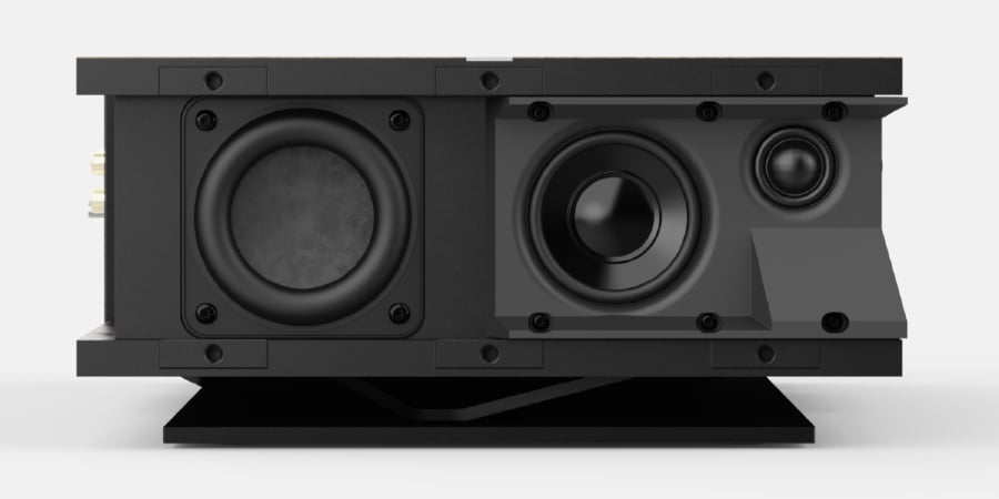 The Evo One packs a lot of engineering into its relatively compact form. Measuring 26.6 inches across, the Evo One isn’t much wider than a Sonos Beam, though it is substantially taller than a typical soundbar, at 5.1 inches high. If you’re planning to use it beneath a TV, wall-mounting the TV will be your best option. Even considering its 11.4-inch depth, it’s hard to imagine how Cambridge could cram 14 drivers into this thing until you see pictures of a disrobed Evo One. There are four 1-inch silk dome tweeters and four 2.25-inch aluminum cone midrange drivers. (As audio reviewer John Darko would say, the midrange drivers in the UK version of the Evo One are made out of aluminium, rather than aluminum.) The low end is provided by six 2.75-inch long-throw woofers. Yes, 2.75 inches is awfully small for a woofer, but six of them have a total surface area bigger than that of a 6.5-inch woofer. Two of the woofers are rear-firing, so you’ll want to leave some space between the Evo One and the wall behind it. The left and right side surfaces of the speaker each house a side-firing woofer, midrange driver, and tweeter. That leaves two woofers, two midrange drivers, and two tweeters creating a stereo pair of 3-way speakers on the front surface. The midrange drivers and tweeters are as close to the far edges of the speaker as possible, presumably to maximize stereo imaging.