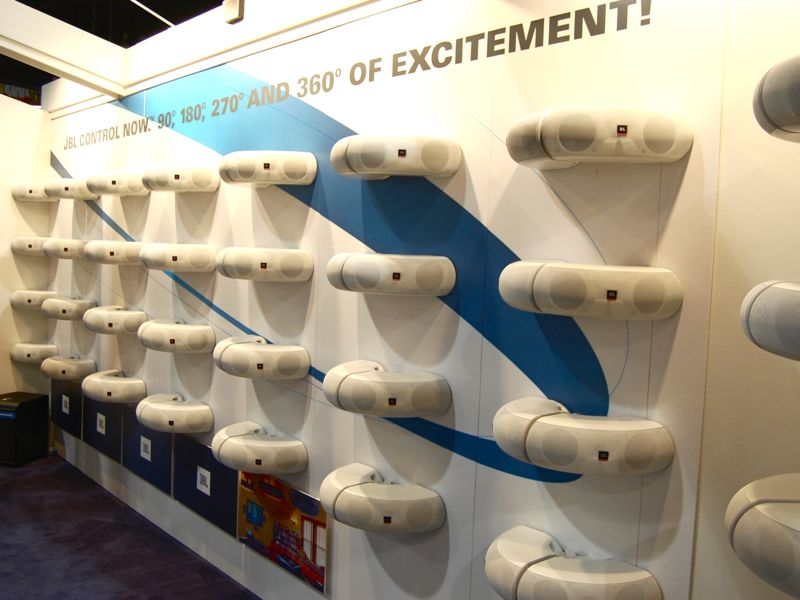 In the JBL booth, the most striking display was the wall of Control Now AW speakers. These all-weather, 2-way dual 4" speakers can be bookshelf, wall or corner mounted. They employ a curved 90 degree design that allows them to be mounted in an endless amount of combinations and orientations. They are sold in a white finish, but also available is a black indoor version. This is a great sounding flexible speaker than can be used all over your home - both inside and out. The outdoor version is not waterproof, but rather weatherproof. You can mount 2 of the speakers for a half-circle design coming off of a wall, or you can mount 4 together in a circle and hang it from the ceiling for a playroom or back porch using a standard ceiling fan mount. The indoor version retails for $249, the AW version for $279. These are available now. For more information, please visit JBL.