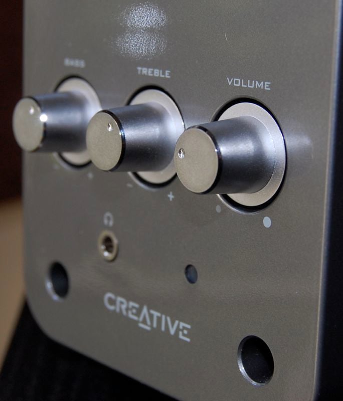 The cabinets are black plastic, with a platinum-grey front faceplate. They are swept back, which angles the drivers towards to your ears, no to mention adding a pleasing aesthetic. The cabinets are ported on the tops, with Creative's BasXPort, which is acoustically engineered to enhance the bass, making up for the lack of a subwoofer. That is a huge difference in this system and many other computer speaker systems on the market - no subwoofer. This is not a satellite system, but rather a pair of (powered) full range speakers.