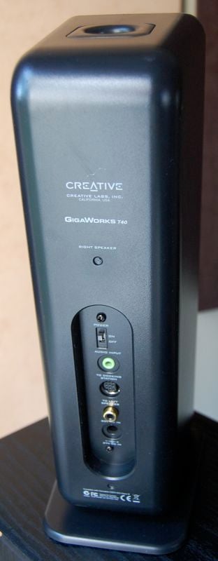 On the rear of the right channel speaker you will find the power on/off switch, stereo mini-jack for Audio Input, a docking station jack (Creative offers a docking station for iPods, sold separately), an RCA left speaker output, and the DC power input jack. The rear of the left speaker has a fixed 6 foot cable that is terminated with an RCA connector.