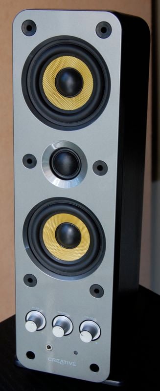 Creative has designed a very good-looking computer speaker in the T40's. They are tall and lean, and have a decidedly audiophile vibe with their MTM (midrange-tweeter-midrange) design, especially with the grills removed. The dual woven glass fiber cones have a decidedly high-end look, with the golden cone and black dust caps and rubber surrounds. The cloth dome tweeter in between the drivers is also black. I highly recommend you remove the grills. Doing so changes the look dramatically. With the black cloth grills in place, the T40's look like a larger version of the cheap stock speakers that came with your Dell or HP computer. But remove the grills and you have a pretty cool looking set of speakers flanking your monitor.