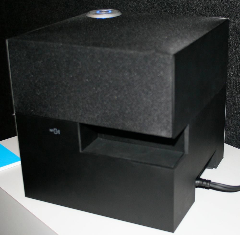As you'd expect for a Bluetooth speaker, the Def Tech Cube is portable with a Lithium Ion battery. The battery life wasn't known but expected to be around 10 hours. The Cube we saw was a pre-production model (or maybe one of the first production) and we spent a few minutes listening to it. It had quite a bit of bass and really filled the small, but open, room we were in. We're curious to see how well all these drivers firing in different directions will perform in a real room. The Def Tech Cub will be hitting Best Buy and other North American retailers next month for a retail price of $399. For those of you across the pond, expect a 240v version out in November. For more information, please visit www.definitivetech.com.