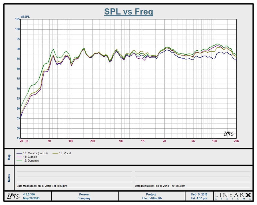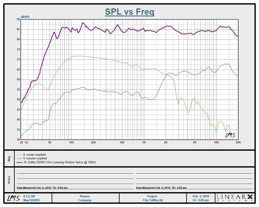 Edifier measurementEdifier proved their mettle as a serious speaker designer with the S2000 Pro active speakers.  They offer an incredibly attractive, great sounding product with plenty of connection options, including Bluetooth 4.1 with aptX for near CD quality streaming.  I had a satisfying listening experience in virtually every scenario I listened to them in.  For $400/pair, these speakers would absolutely obliterate ANY soundbar on the market in terms of both fidelity and aesthetics.  I mention this because the Toslink input makes them really easy to connect to an HDTV display and anyone serious about sound will thank me for this recommendation over a cheesy little soundbar that barely improves upon the sound of the internal speakers of their HDTV.  Imagine having an attractive, compact, affordable speaker package that works with your TV, streams from your Smartphone and sounds great in all scenarios?  Edifier has made me a believer with their S2000 Pro speakers, and I suspect they will do the same for you.