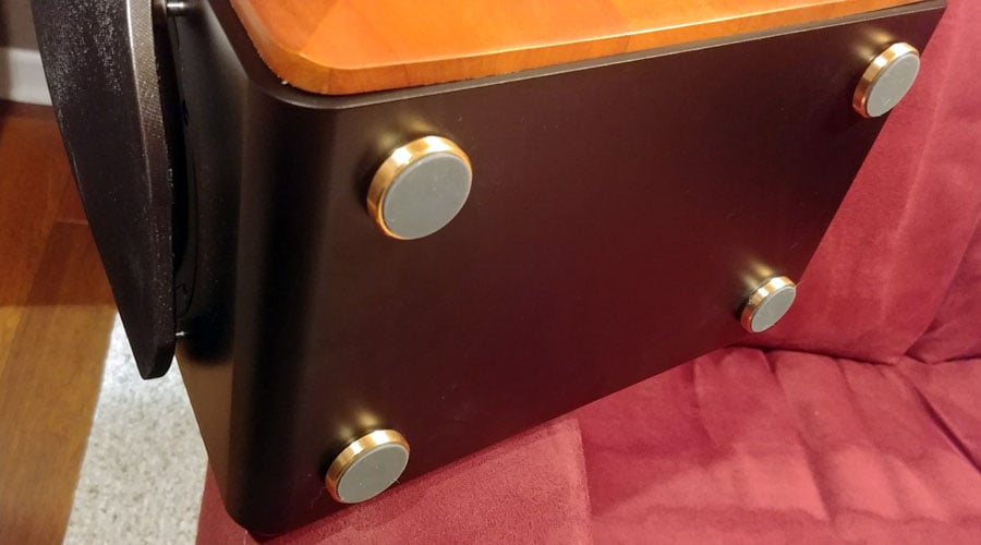 The brass feet with rubber padding is a nice touch, especially when installing these speakers on a desktop.  It keeps them sturdy and minimizes resonance transfer to the surface they reside upon.