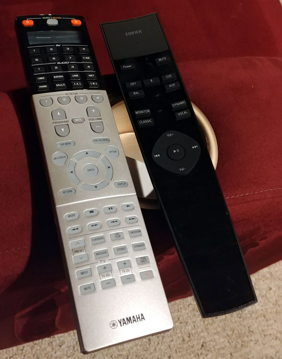 Edifier Remote controlAbout the most bizarre thing about the Edifier S2000 speakers other than the overly long connection cable previously mentioned is their hulking remote control that is unnecessarily big, almost the size of my Yamaha CX-A5100 11.2CH preamp/processor remote.  With all of its sharp edges, it's also about as safe as Kylo Ren's Lightsaber.  Seriously if anyone ever broke into my home, I'd probably reach for this remote before my handy baseball bat and just use it as a stealthy projectile weapon.  I'm a bit perplexed why Edifier thought they needed to design a remote control so large and elaborate like this just to control source and EQ selection, power and volume and playback control.