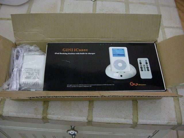 GINI sent me two products: the iTube, which includes the sub and two satellite speakers, and the iConec, which is an iPod docking/charging station. The iConec comes in very typical Chinese packaging - cheap, thin cardboard. Oddly, it has an AC adapter packaged outside of the box, placed next to it in a brown cardboard box.