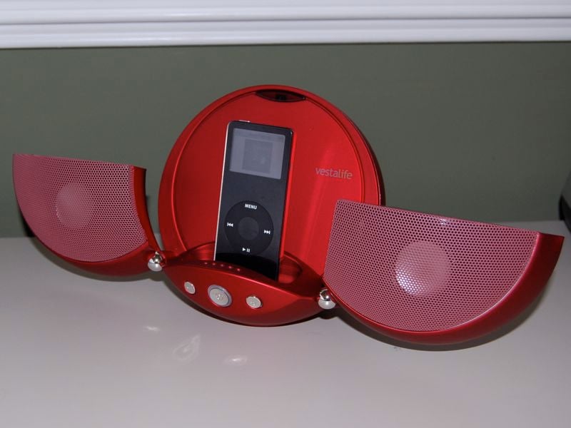 Maybe you are looking for whimsy in your iPod speakers. Whimsy is defined as "a thing that is fanciful or odd." The Vestalife Ladybug is both odd and fanciful. Odd in that it looks like, well, a ladybug. It is a round ball with "wings" that open out to reveal a dock that is compatible with any iPod with a dock connector. But it could also be seen as fanciful because it is sure to draw a smile as it sits on your desktop. Not only is it fun, it is quite functional. The two wings that fold out are actually speakers, and there is also a subwoofer on the rear of the unit, as well as a USB connector for synchronizing with your computer, an AV Out for video output, and an auxiliary-in jack to connect non-docking iPod, CD players, or other MP3 players. The unit comes with a small remote control, a soft travel pouch, and can be powered by an included AC adapter or 4AA batteries. Available in several colors, my review sample came in ladybug red. The finish is slightly metallic and has a rubbery feel.