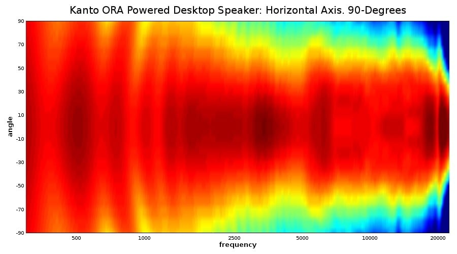 The above graphs depict the speaker’s lateral responses out to 90 degrees in five-degree increments. More information about how to interpret these graphs can be read in this article: Understanding Loudspeaker Review Measurements Part II. Here we get a more detailed look at the exemplary horizontal response of the Kanto ORAs. As would be expected of such small loudspeakers, these have a fairly wide dispersion. They cover a wide angle with a very flat and tonally neutral response. One interesting characteristic to note is that even though the tweeter is set in a shallow waveguide, it does not start to disproportionately narrow in dispersion in upper treble as we see so often. This tells us that the waveguide is doing its job throughout the entirety of the tweeter’s bandwidth. It beautifully matches the directivity of the woofer while keeping the tweeter from collapsing its dispersion at the top. This waveguide is the result of some top-notch engineering.