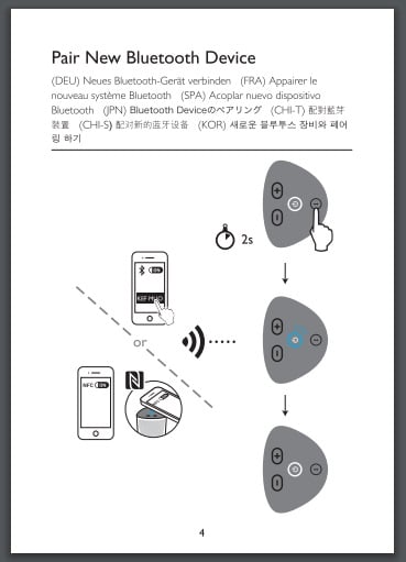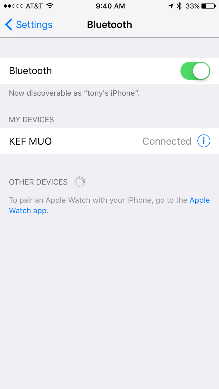 so that KEF optioned for a pictorial quick start guide to get you going. Once the power button has been depressed a 4-tone signal from the speaker tells you that it is on and the power button will light up blue when fully charged. In the settings menu of my iPhone 6 I turned on my Bluetooth option and once the MUO was recognized by my phone I clicked on the KEF MUO tab. After 2 - 10 seconds another 4-tone signal from the speaker tells you that the speaker is now paired with the phone and you’re ready to play your tunes.