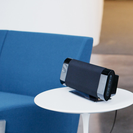 Housed in a sleek, black case, the G-17 Air sports two .75" (1.9 cm) aluminum diaphragm compression drivers mated to dual 90° x 90° square Tractrix Horn-loaded tweeters. Each of the drivers has their own amplifier (20 watts each to the woofers, 10 watts each for the tweeters). There is a rear, side-firing port to increase bass response down to a spec'ed 57 Hz -3dB with a claim of usable bass down to 47 Hz. While we have mixed feels about horn-loaded tweeters in general, in a small speaker application like this, they make a lot of sense since they can put out a lot of output without a lot of power.