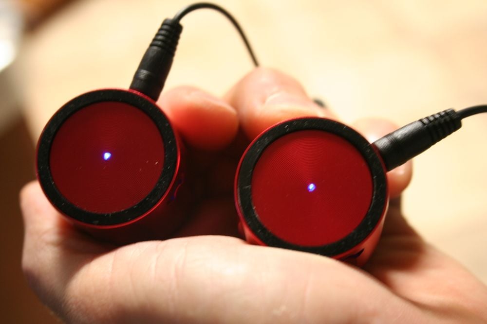 The kubxlab Earshots come in two colors - red and silver. I'm actually shocked they don't come in black. Everything else does these days. They have a single driver (they don't specify the size but since the Earshots are 34mm across, the driver is probably 32 or 31). The enclosures are constructed out of "high quality aluminum" and they are rechargeable via a USB cable (both speakers are charged at the same time). There is no indication that you can play music when connected to a computer by USB, however, so it seems that there are no internal DACs (which isn't surprising given the size). For playback, the speakers connect to your portable device or computer via the 3.5mm headphone output.