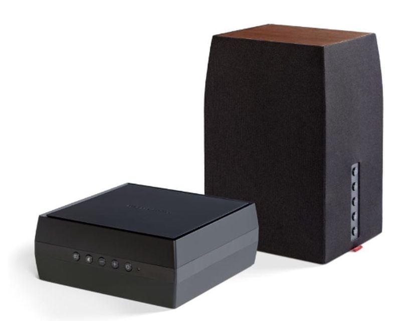 If the Crescendo is too big or too expensive for your needs, the Bravado may fit the bill. Marketed as a "luxury wireless bookshelf speaker," the Bravado is wrapped in either a black or white cloth grille designed to compliment an artistic accent on op of each speaker — walnut on the black cloth finish and gloss while on the white cloth finish. Side mounted controls allow the user to easily adjust volume, select inputs, and power the speaker on or off.