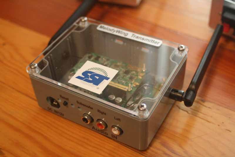 To give you an idea of just how much of a preview this was, the wireless transmitter and receivers came in a case with clear acrylic tops so that manufacturers could examine the component utilized within. Personally, I'd consider rounding off some edges and calling it a finished product... almost. It's at least a cool idea and I haven't seen too many "peek under the hood" products except for tube amps with half of their parts hanging out for show. One advantage to the acrylic tops was that I was able to note they utilized quality components and the power supplies were fairly robust compared to the scant amplifiers I've seen in past attempts at wireless systems. The onboard digital amplifiers are rated to 24wpc in stereo, or 48wpc mono. The amps automatically sense the attached load and will bridge the output for a mono signal to each speaker (which is how we utilized the system in our demo.)