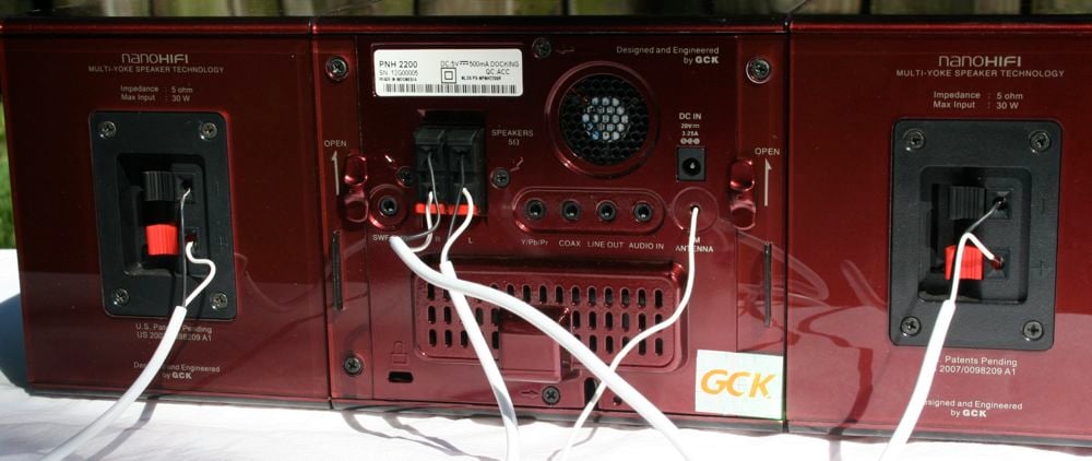All of the NanoHiFi units have a front USB port for portable music. There is a 3.5mm port on the back for piping in music from your portable device as well a 3.5mm jack for outputting music. There are a few other ports (all 3.5mm) labeled Y/Pb/Pr, coax, and sub. The Y/Pb/Pr is for outputting component video to your display (a pretty cool thing especially since NanoHiFi included a cable), the coax is for composite video and stereo audio (also cable included), and the subwoofer is for adding a sub. This gives the NanoHiFi the ability to stretch beyond a "boombox" or desktop system and become the mini-hub for a secondary system. It's a secondary system powered off your portable device but, honestly, sometimes that is all you need. Adding a sub is a huge advantage especially for those of use that just happen to have older subs lying around waiting for a use.