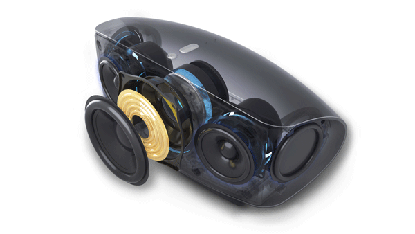 The bass radiators are located on each side of the enclosure opposite each other designed to enhance the bass response and cancel unwanted vibrations in the speaker enclosure. The 3.5” bass woofer features a heavy magnet system and large linear displacement capabilities. The bass radiators utilize linear suspension with optimized axial stability to avoid distortion at high volume levels, and the 2.5” wideband drivers use a high energy Neodymium magnet system with copper shorting caps normally found in higher-end speakers.