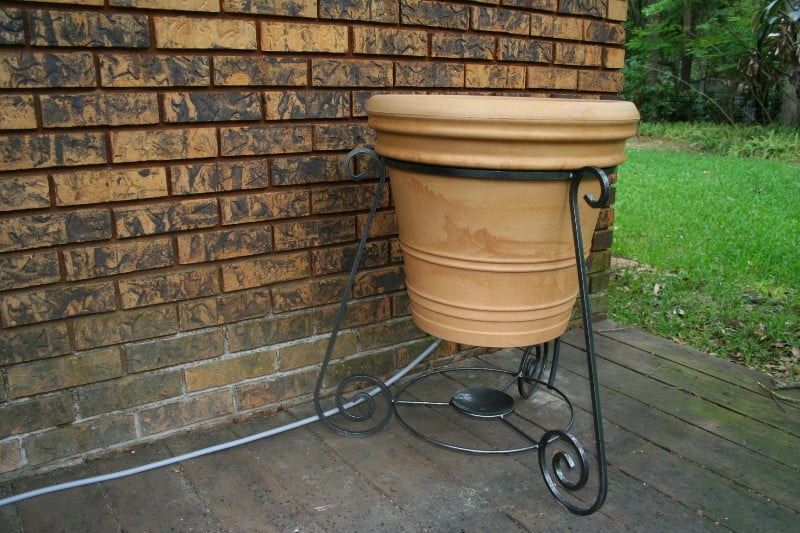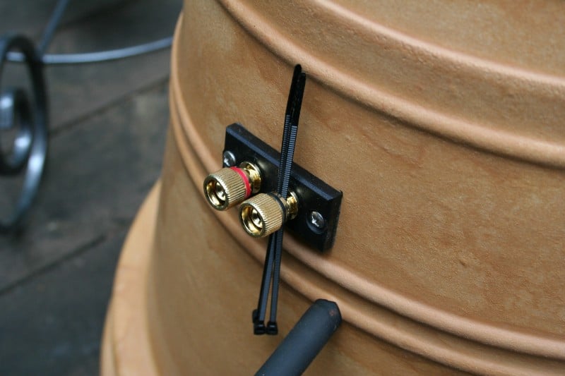 Out of the side of the planter is a long rubber hose for drainage. If you look inside the planter, you’ll see a number of drainage holes that feed a reservoir which feeds that tube. Near the drainage tube are two five-way binding posts that you’ll likely only use one way – bare wire. Each binding post has a rubber cap to keep your connection safe from the elements and three small tie downs for neatly securing your wire and the drainage tube to one of the cast iron legs of the stand.