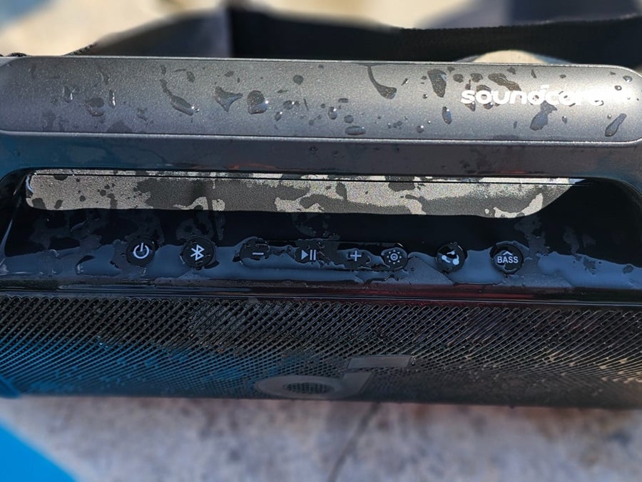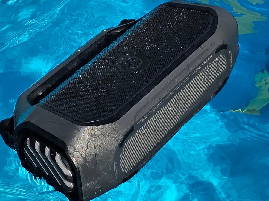 As advertised, the speaker can get VERY WET! Testing around the pool over Memorial Day weekend, we used this speaker exclusively for our pool party, and we sat the speaker on the edge of the pool so we could hear the tunes and see the lights while swimming late into the evening. The speaker got heavily splashed from several unexpected “Cannonball” jumps and kept pumping out music. Soundcore advertises that this speaker can float; Audioholics put this claim to the test in our saltwater pool and found that the unit can, in fact, float and will continue to play tunes if briefly submerged for a quick second when being thrown in the water.
