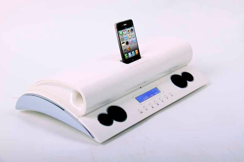 From the people that brought you iPig, iPanda, and miSoccer, comes the latest desktop iPhone creation: the iExecutive. The iExecutove is an iDevice dock that is, thankfully, not shaped like an executive. Rather, the iExecutive looks more like a white, pregnant PS3 and is designed to serve as the "ultimate iPhone, iPod and Audio accessory for the contemporary office." As you can see, it has a white gloss finish and an unusually curved design. The dock is located on top in the center and a small LED display is below. The LED is easy to read from all angles and gives the required information for source, volume and the clock. Speaking of the clock, it was easy to set, but since the LCD doesn't have a variable backlight, we don't recommend the iExecutive be placed next to your bed. The physical controls are located underneath and give you access to Play functions as well as volume. Power is turned off via the remote or with a simple switch located on the backside of the unit.