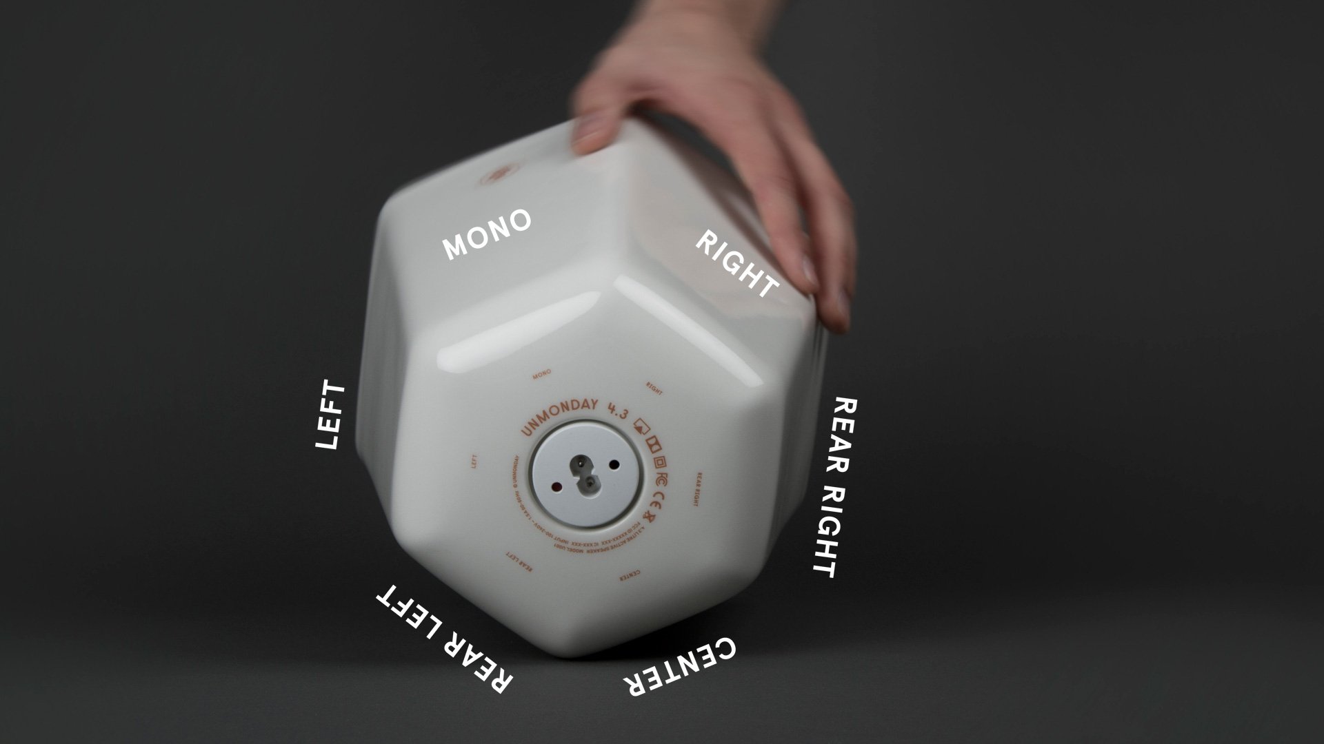 But that isn't all that is unique about the Unmonday 4.3L speaker. Utilizing a hexagonal, porcelain enclosure, the 4.3L has one of the most unique control schemes we've seen. Basically, there is an accelerometer within the speaker which tells the speak which side you've set the speaker on. This will configure the speaker for Left, Right, Center, Surround Right, Surround Left, or Mono output. Since AirPlay at this time only supports two channel audio, there is a Dolby Surround decoder in each speaker for splitting out the sound to the appropriate speaker.