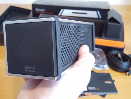 The REMIX is a small rectangular box available in your choice of black or silver, black being a faux-leather finish while silver is a flat gunmetal aluminum, that’s the model we’ll focus on here. The metallic encased speaker with a black grille on front and back exudes rugged quality. Heft the 1.9lb speaker in one hand and it feels like a serious piece of electronics - it’s dense, weighty and there is certainly no hollow plastic to be found. It’s not just portable, it’s lean, heavier than it looks, and it feels like every square millimeter of space it occupies serves a purpose.