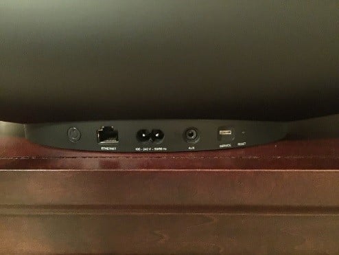 The Zeppelin Wireless is an odd elongated football-shaped speaker with a small centered base. On the base is the branding and a single button with the Bluetooth logo. Around back are connections for an Ethernet port, power cord, and a single 3.5mm auxiliary input. On the top are three large but nearly unnoticed buttons for play/pause, rewind, and forward. Ultimately, the speaker is designed to be set up and then not touched again.