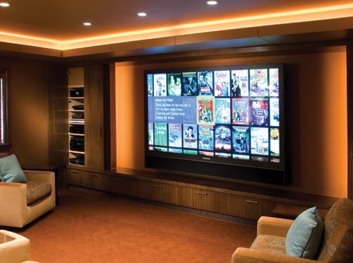 That’s a particularly handy feature, considering how the residence is laid out. The kids’ main video game playing area, for example, is located in a space above the garage, away from the common areas of the house. “It’s a place where her 5-, 9- and 11-year-old can really let loose,” says Calderone. He and his team outfitted the room with two Sony 46-inch LCD TVs, Sonance in-ceiling speakers, RTI remotes, Wi-Fi, and of course, the usual fare of gaming systems: Xbox 360, PlayStation 3 and Wii.