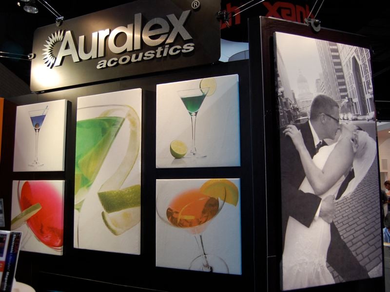 auralex sonicprintLong known for their innovative sound control solutions, Auralex launced their new SonicPrint.  If you have needed to add some acoustic panels to your listening room but find them boring, this is a product you will be interested in.  The SonicPrint custom-printed Pro-Panels are fabric-covered absorptive panels designed as artwork.  Choose from a huge library of licensed images (with more agreements to come - possibly including the NFL and Disney!) or send them your own digital image and Auralex will assemble your panels that you can easily install, giving you a truly custom listening room aesthetic.  You are no longer limited to single color fabric choices when designing your room, opening up limitless decor options for your home theater.   The booth had all kinds of designs on display, from a brick wall pattern to black and white photographs to stylized martini-glass images.  A very cool concept that I found to be one of the coolest things on the show floor this year.
