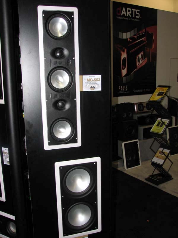 RBH InwallRBH wouldn't be at home if they didn't introduce yet another in-wall speaker product.  I swear they must have an in-wall speaker for every conceivable application known to man.  Their new MC-553 is a two-way design sporting three 5 1/4" aluminum cone woofers and two 1" silk dome tweeters.  This system is designed to play LOUD and provide a wide range of coverage for a large upscale theater room whose focused on unabtrusively  good sound quality.  Pricing and availability aren't yet available and there were no press kits at their booth to speak of.  We love the folks at RBH but it may behoove them to put forth a little more marketing effort in their products as they are still so engineering focused after all these years.  Nevertheless this looks like a killer in-wall speaker and should surely be considered by folks that are serious about getting that "better than being there" experience without plopping down giant box speakers in your theater room.