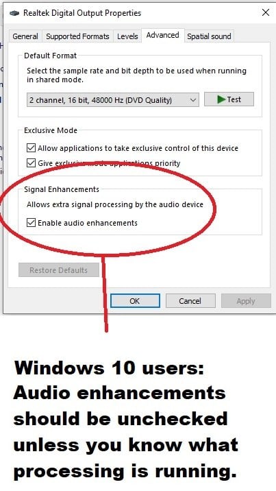 - In Windows 10 under the sound device properties panel, click on the “Advanced” tab, and there will be a section under that tab which is labeled “Signal Enhancements” that has a checkbox next to the text: “enable audio enhancements” - make sure that checkbox is blank!