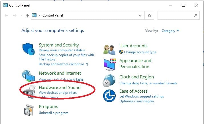 - Click on the text “Hardware and Sound” and that should bring up another panel of control options.